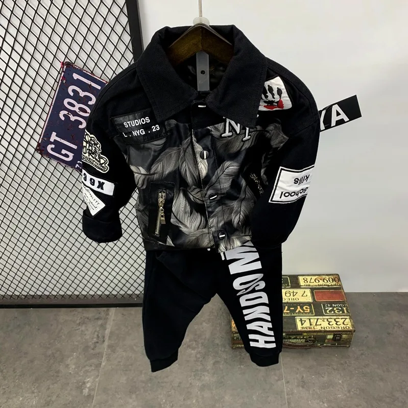 Sale!2PCS WLG boys clothing set kids spring autumn black printed denim jacket and pant set baby fashion outfit children
