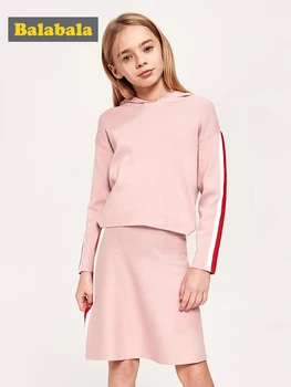 Sale!Balabala Girls 2-Piece Fine Knit Hooded Sweater Longer Back + Knit Skirt with Side Stripe Set Teenager Girls Clothing Set