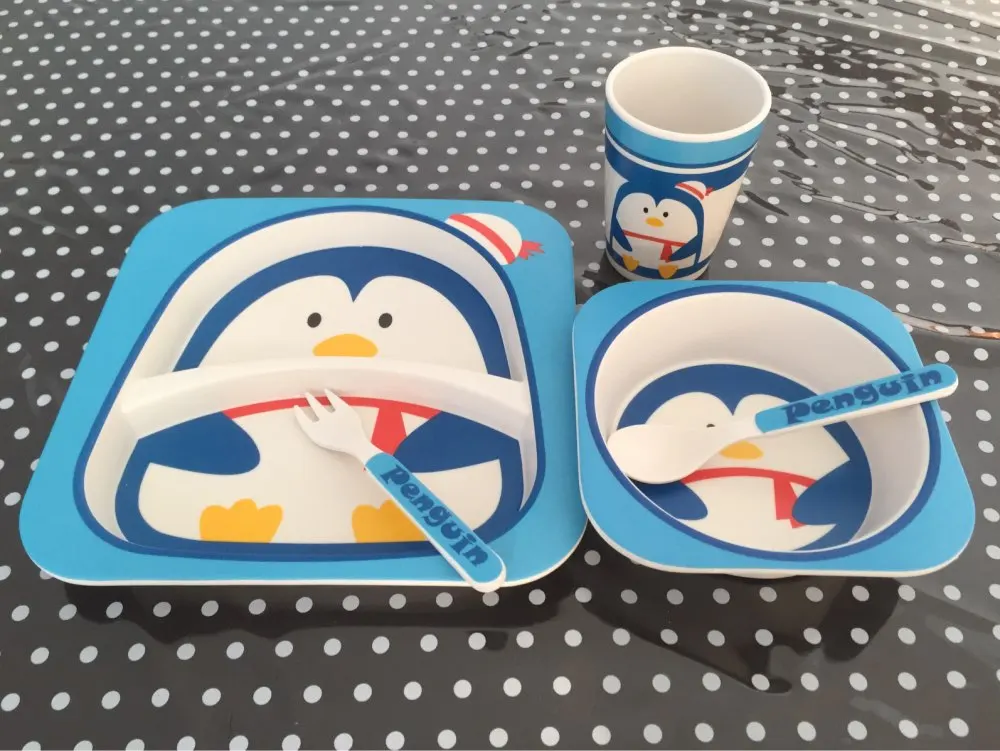 5pcs/sets Baby Dish Tableware Set Cartoon Fork Feeding Dishes for Kids Utensils Natural Bamboo Fiber Bowl With Cup Spoon Plate