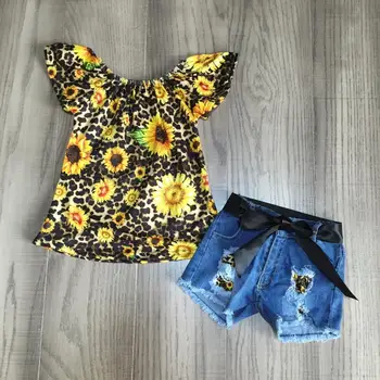 new arrivals summer baby girls children clothes outfits leopard sunflower denim shorts cotton milk silk top ruffles$47.97 Select options