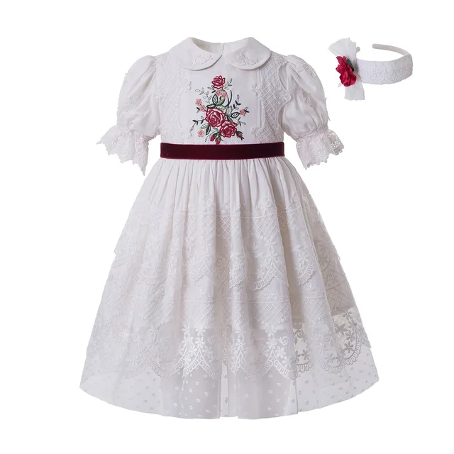 Pettigirl Summer Party Kids Dress White Embroidery Puff Sleeve Girl Wedding Kid Dress Kids Clothes With Headdress A440